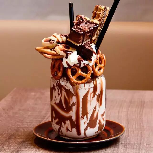 相信资深吃货们已经不是第一次见到这杯甜点了,这道名为over-the-top shake的甜品名副其实,大大的杯子顶端层叠着椒盐卷饼、巧克力派、棉花糖等等各种小零食,感觉一不小心就会掉下来!那一大杯醇厚的奶昔也有四种口味可选:焦糖、巧克力香蕉、巧克力威化和香草。还在等什么?赶紧约上三两闺蜜、前去分享这满满的甜蜜吧!