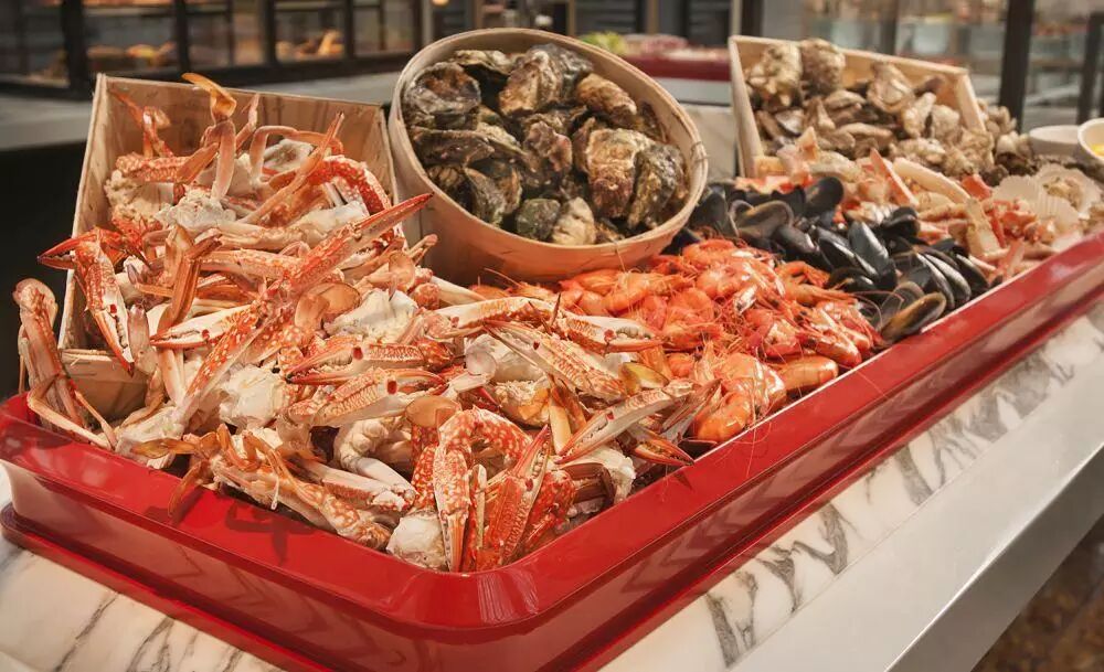 这家自助餐厅共分8个区域,分别提供来自中国、印度、印尼、马来西亚和西方的美味。最夺人眼球的当数随处可见的生冷海鲜,有帝王蟹腿、生蚝等等;烤肉区除了香气扑鼻的烤肉,还有印尼著名的牛尾汤和伊比利亚烤乳猪;印度菜有黑椒虾球、蒜香羊排和各种奶制品;水果区、烘焙区和法式点心区更是种类丰富、令人眼花缭乱。