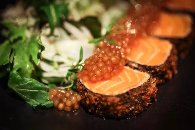 据说这家店提供的是“新美洲”餐饮,不要问我、小K也不懂怎么解释,吃了就知道~首先看这道人气菜肴:软嫩多汁的鲑鱼肉被紧紧包裹在煎得脆脆的紫菜里,顶部放着颗粒饱满的鱼子,搭配的茴香沙拉不仅抵消了腥味、还完美释放了整道佳肴的鲜香。
