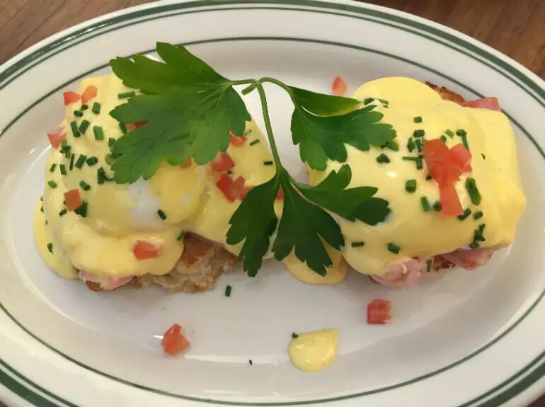 这款班尼迪克蛋(Egg Benedict)看起来很新奇吧~软硬适中的鸡蛋被厚厚地铺在松脆的黄油饼干上,口感丰富、回味浓厚,满满的咬一口、咀嚼起来满足极了!更多惊喜,等您自己前去发现咯~