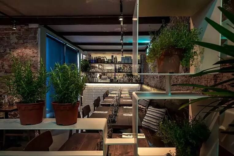 这家地中海风味餐厅不太好找,它隐藏在小巷中,门是不起眼的灰色、门旁有棵更不起眼的橄榄树。而一旦进入,那就别有洞天了。深色简朴的家具,随处可见的绿植,与裸态的砖墙,让你一瞬间仿佛置身于荒郊小镇。