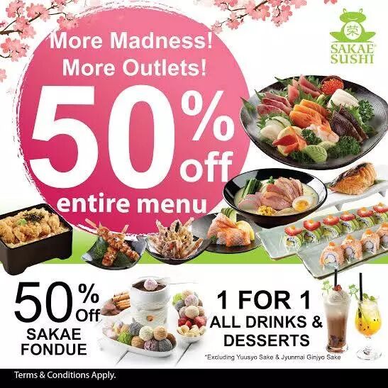 所有寿司、奶酪火锅都有半价优惠!甜点和饮料买一送一(也就相当于半价了~)只在指定分店有效。
