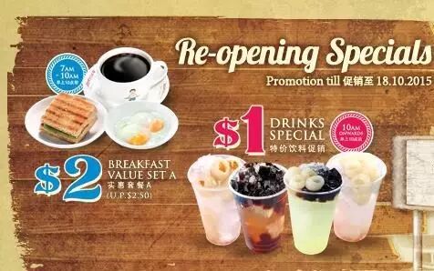 怡丰城(Vivo City)负二楼的食阁重新开业啦~迎接我们的不只有焕然一新的环境,还有开业特惠哦!上午7-10点早餐只要2新币,10点过后果汁只要1新币。