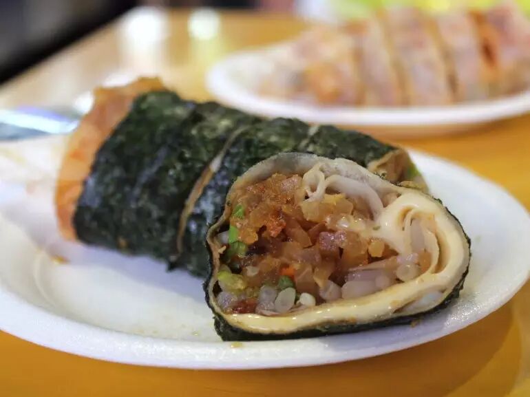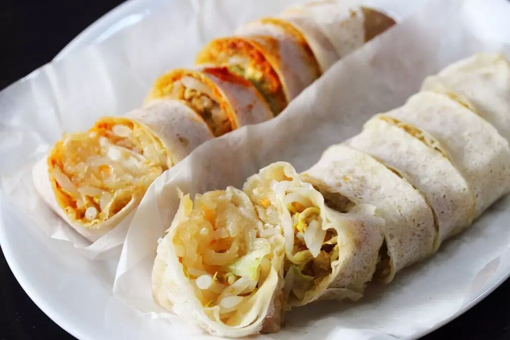 薄饼里可以选择卷的东西非常多:煮熟的白萝卜丝、豆丝、蛋皮丝、虾仁、香肠、豆芽,调味料可以加蒜蓉、辣椒酱或甜酱;有些店家还会在冰皮外裹一层海苔,更添香脆!