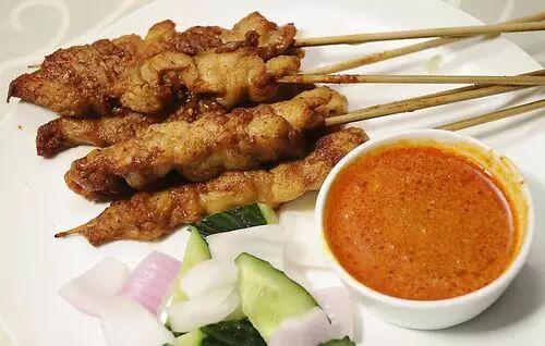 腌制锅的鸡肉、牛肉和羊肉块以竹签串起,经过炭烧后,香气四溢。吃的时候再蘸上厚厚的沙爹酱,美味绝顶!现在还有用海鲜做沙爹的,也可以一试。