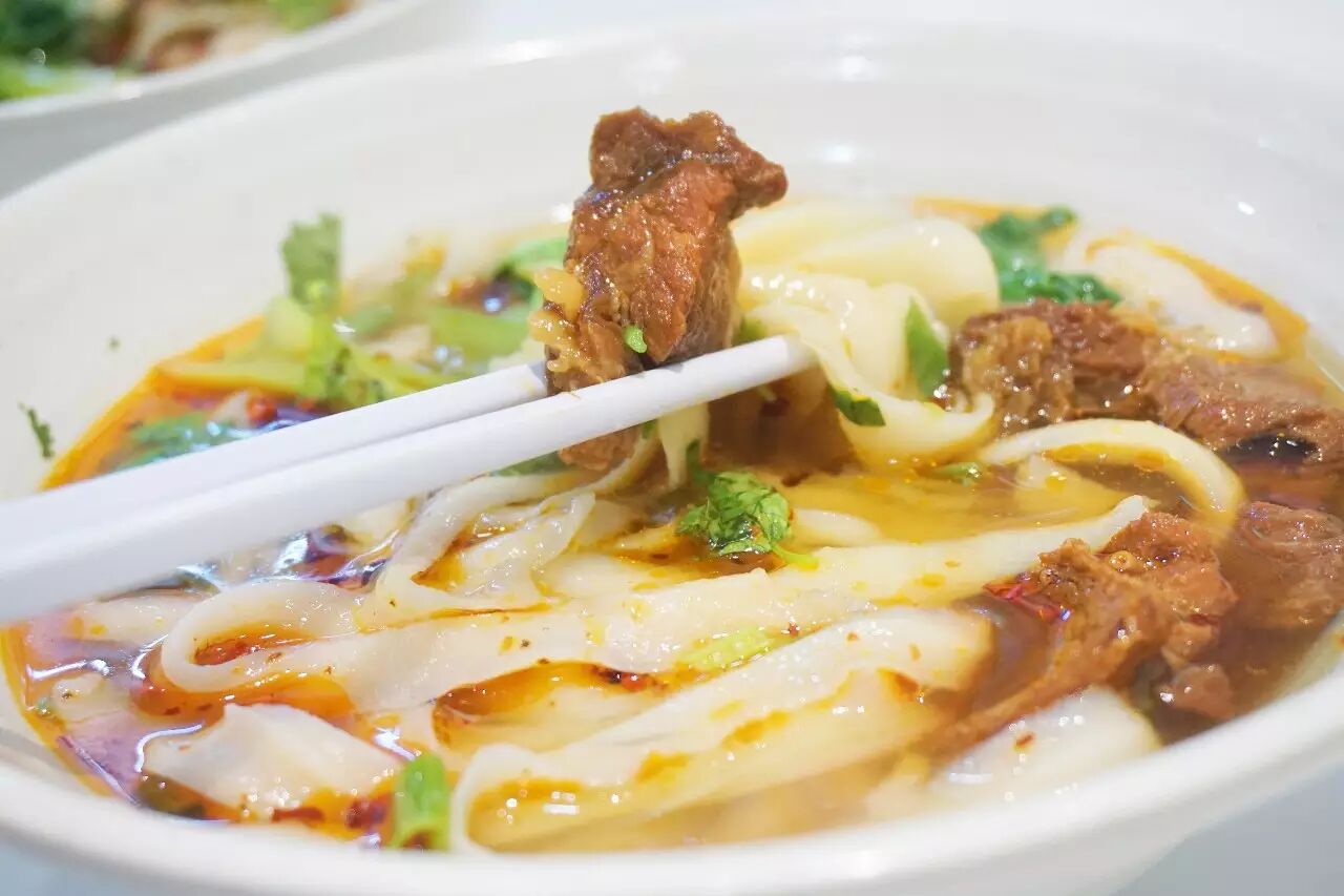 面条筋道,“中间厚两边薄”的经典特征使得每根面条都鲜香入味;面里的牛肉也不少,肥瘦相间。(上桌时是不辣的哦,爱吃辣的伙伴可以自己加辣油)。