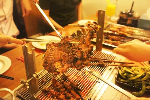 还等什么?大刀大叉动起来呀!架在炭火上的羊腿始终能够保持适合口感的温度。