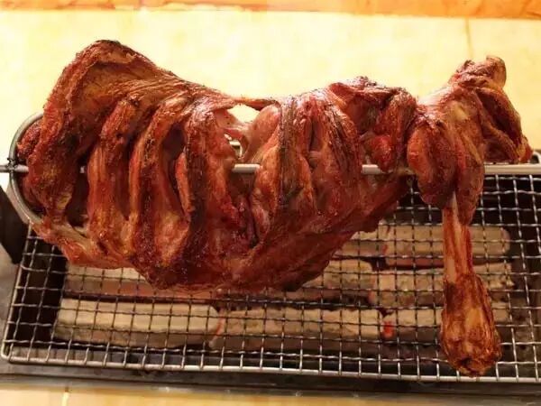 胖爷在羊腿烘烤过程中增加了各种配料和调味品,使其形、色、味、鲜集一体,色美、肉香、外焦、内嫩、干酥不腻,被赞为"眼未见其物,香味已扑鼻"。