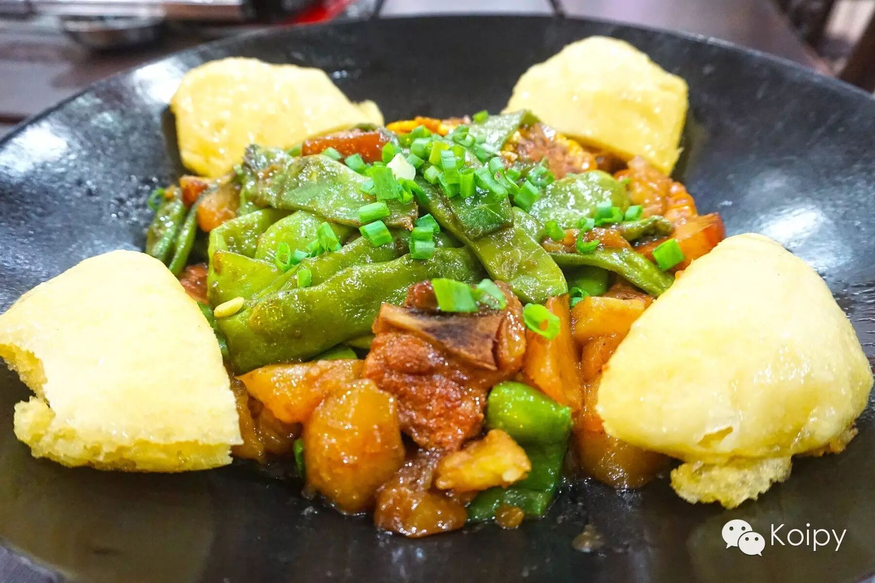 锅边贴几个玉米面饼,锅里焖着香软入味的扁豆、土豆和玉米,恍惚仿佛置身东北的炕上。那些为了减肥不吃主食的妹子在这道菜前毫无抵抗力,软糯的土豆太好吃了!