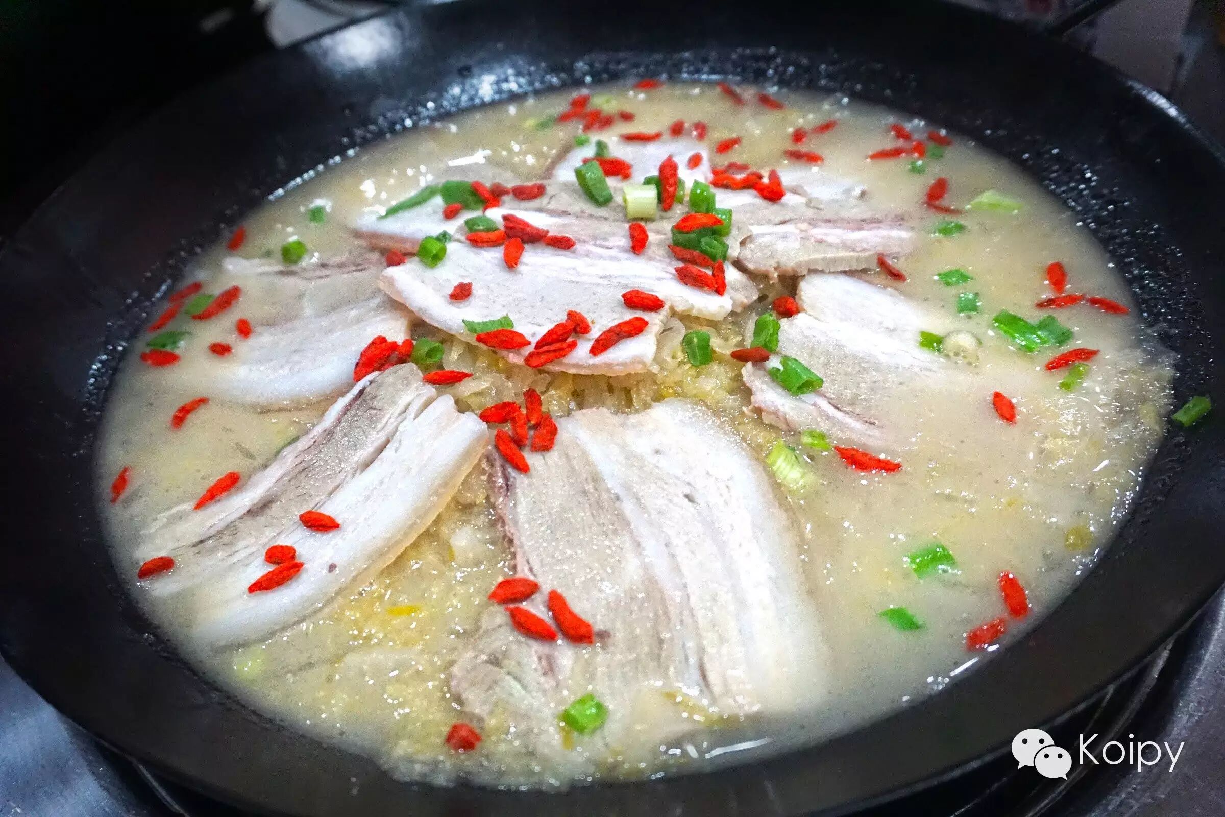 先喝一口汤,再吃一大口酸菜,再来一片五花肉,肥滋滋、酸溜溜、香喷喷,让人欲罢不能!店家别出心裁加的枸杞更添香甜。
