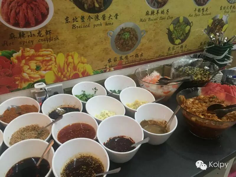 【东北人烤肉坊】的酱料台、比起火锅店也不逊色,还有好吃的腌菜和水果罐头~给我一碟辣白菜、我能解决两碗饭哈哈!