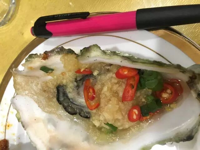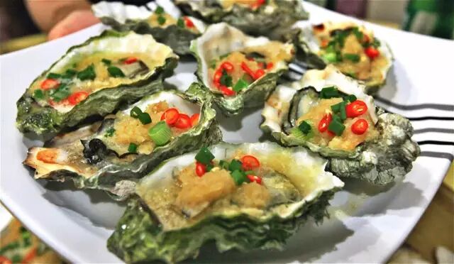 话不多说,生蚝先来打头阵!将生蚝放在炉子上热烤,当蚝汁逐渐渗出时,撒上葱、蒜等调料。随着啪的欢快声响,浓烈的香味徐徐散发出来,这时,眼睛与鼻子已经提前享受着美味,而唇齿间的欲望更加浓烈起来,唾液开始流出,期待着与蚝汁的交融。