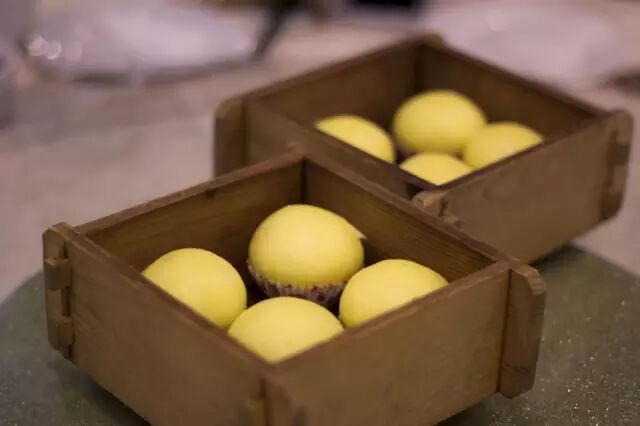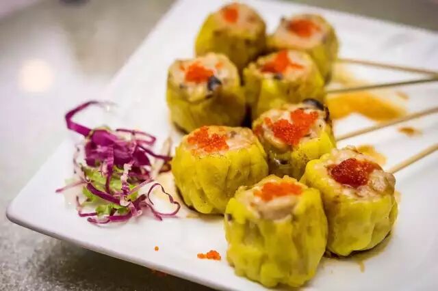 烧麦相信大家都吃过,可是串成串的呢?虾和猪肉馅的烧麦并没有使用传统的蒸法,而是采用传统粤系菜做法,直接放锅内煎制而成。烧麦上的鱼子酱成了烧麦的点睛之笔,作为头菜,看上去就让人食胃大增。
