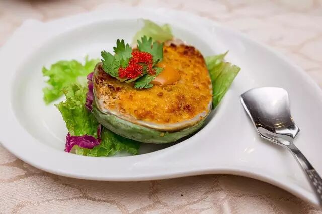 主角来喽!说到九孔鲍鱼,就知道这道菜来头不小。那加上鹅肝酱的鲍鱼更是让小K和他的小伙伴们大开眼界。西式焗烤做法的鲍鱼令人食欲大增,金黄酥脆的表皮内藏着鲍鱼粒、香菇、洋葱和来自澳洲的芝士。一勺下去,一口地满足。