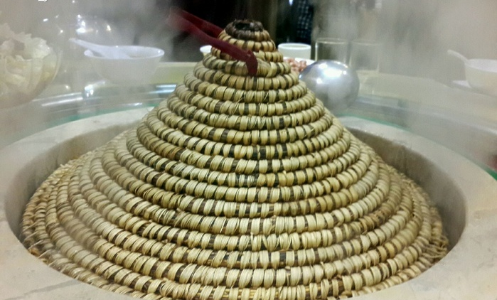 蒸汽石锅鱼的基本原理是这样:每个桌子中央的石锅底下有一个通气的阀子,把鲜活的鱼切好放进锅里,倒入配好的清汤,然后把“草帽”盖上,静静等待蒸汽与每一片鱼肉的亲密接触。