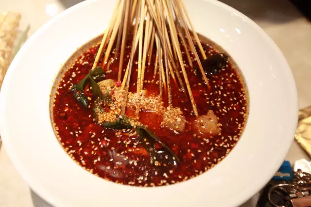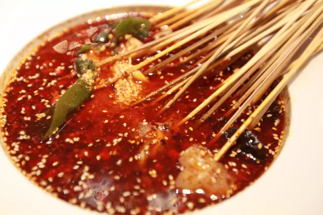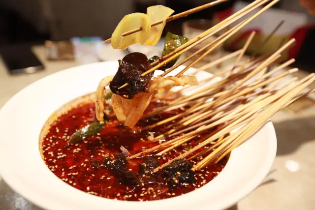 大白瓷碗中,密密插满了竹签,吃起来方便而趣致,浸在清可见底红汤中的鸡块、豆皮、黑木耳被细细地穿在了竹签上,吃起来果然是别有一番风味,颤巍巍竹签尖缀着的食材在吸饱了汤汁之后,红亮的汤汁顺着鸡块缓缓滑落,芝麻的醇香混合着鸡肉的辣味在舌间泛滥,雪嫩的土豆片、滑而厚实的木耳,荤素搭配让人忍不住一串接着一串。