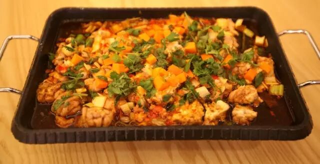 整整一个大茄子平铺在烤盘上,伴有肉臊子和小米辣,最上面还满满地撒了香菜和香葱,让人看到就食指大动。整道菜的味道很讨喜,茄子外皮香脆、口感绵软,辣中似乎又透着些甜味。