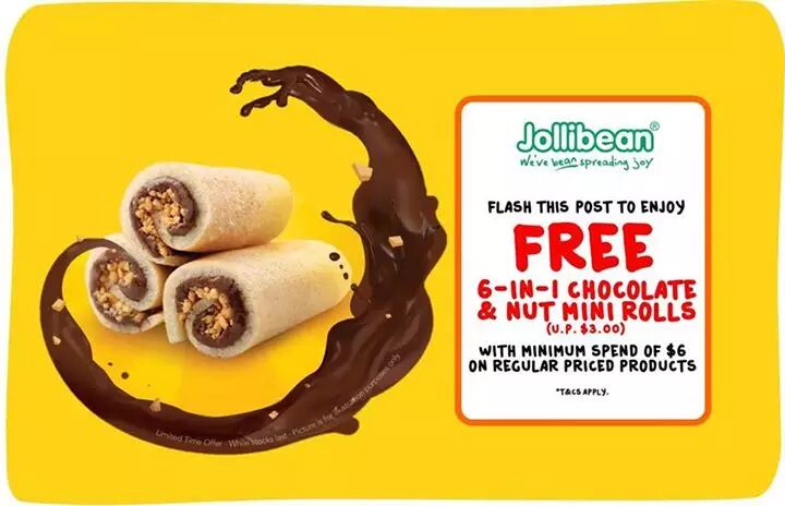 凭上图到Jollibean门店,消费满6新币即可得一个迷你巧克力坚果卷。巧克力和坚果的搭配、像是黑和白一样经典。